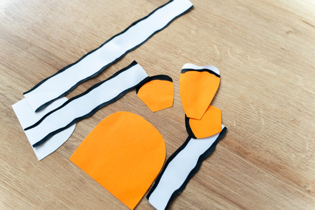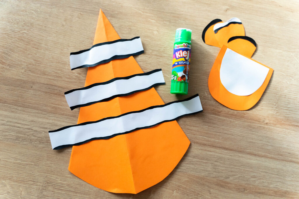 W przypadku błazenka przed nacięciem szablonu przyklejamy białe, nierówne paski z pomalowanymi na czarno bokami.